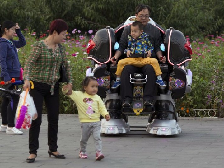الصين، رجل وابنه يركبان رجل آلي في حديقة عامة في بكين.