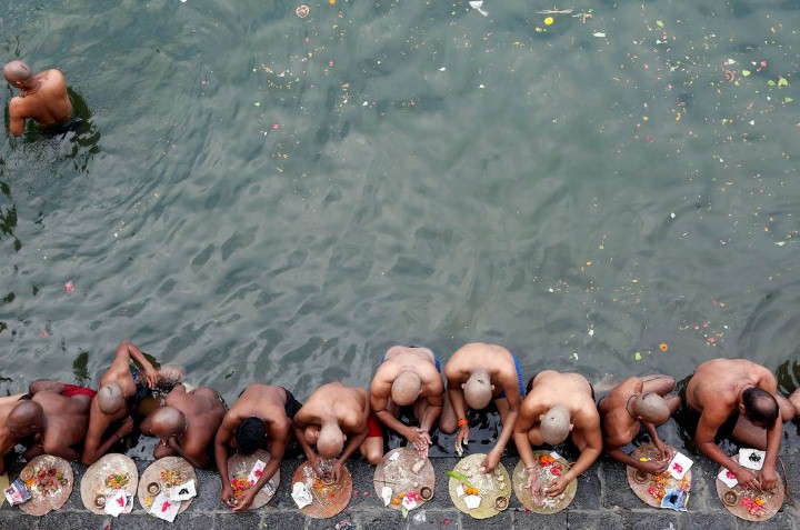 الهند، رجال يؤدون طقوس هندوسية في بركة لتكريم أرواح أسلافهم خلال ما يُسمى باليوم الميمون في مومباي.