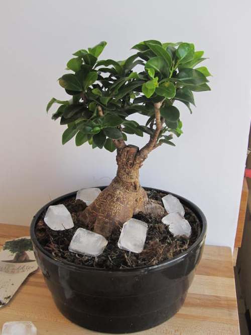– ضع من واحد إلى ثلاث مكعبات ثلج على سطح التربة، استخدم المكعبات الكبيرة لأوعية النباتات الأكبر حجمًا، ودعها تذوب تمامًا.