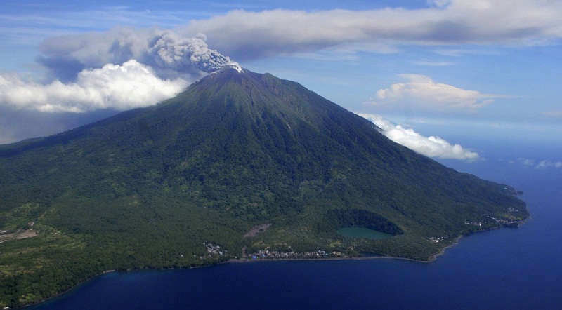 بركان جبل Karangetang ينفث النيران، أندونيسيا.
