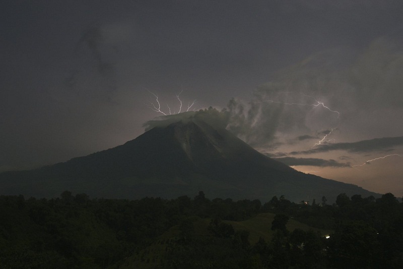 البرق يضرب جبل بركان سينابونغ في أندونيسيا.