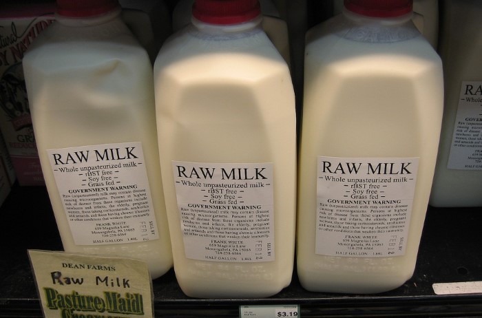 تحظر 22 ولاية أمريكية وكندا الحليب الخام، أو غير المبستر، لما قد يشكله من خطر السالمونيلا، وأمراض أخرى تتسبب بها الجراثيم. لكنه يباع في أفريقيا وأوروبا وآسيا مع جدل الأطباء حول آثاره الصحية.