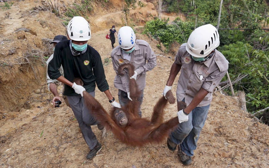 02 سبتمبر 2015 – إندونيسيا، مسؤولون من مؤسسة الحفاظ على البيئة ينقذون أنثى قرد من مزرعة نخيل معزولة في منطقة باتانغ لانجات بمقاطعة سومطرة الشمالية.
