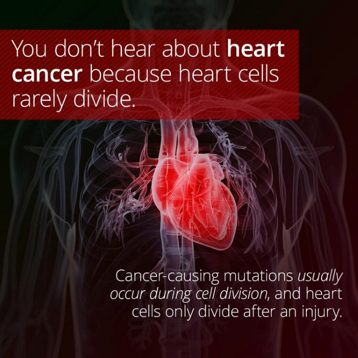 وفي حالة القلب، فإنه نادرًا ما يتعرض لعوامل خارجية أو داخلية تزيد حدوث الطفرات في خلاياه، وبالتالي، نادرًا ما يتعرض الشخص للإصابة بـ سرطان القلب.