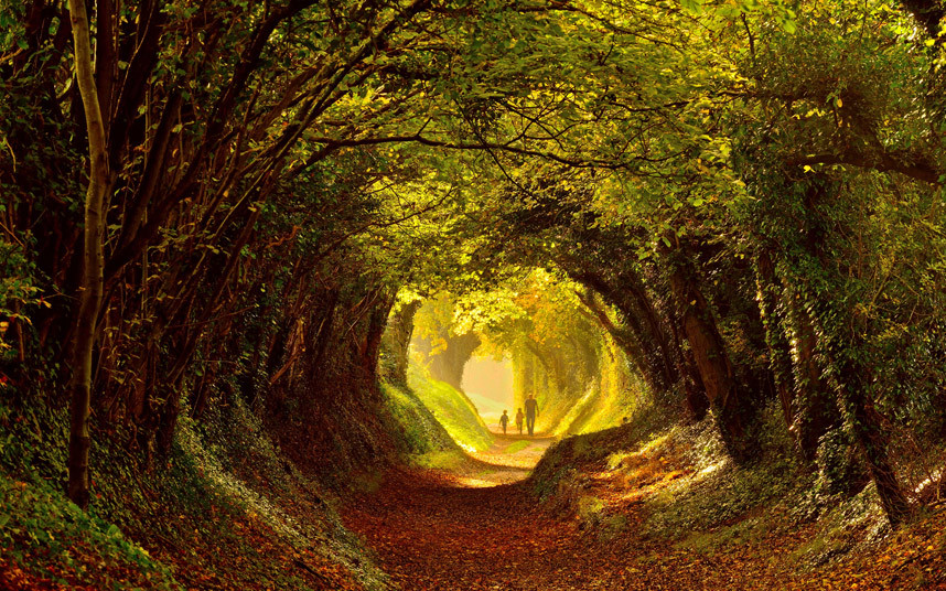 04 نوفمبر 2015 – انجلترا، عائلة بريطانية تمشي عبر طريق خريفي جميل غرب مدينة ساسكس.