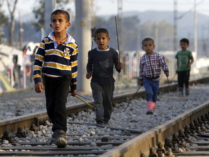 05 أبريل 2016 – اليونان، أطفال اللاجئين يمشون على خط السكك الحديدية بجانب مخيم مؤقت للاجئين بالقرب من الحدود مع مقدونيا.