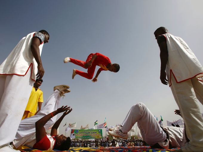 05 أبريل 2016 – السودان، أداء بهلواني خلال مظاهرة نُظمت بمناسبة زيارة الرئيس السوداني عمر البشير إلى بلدة زالنجي.