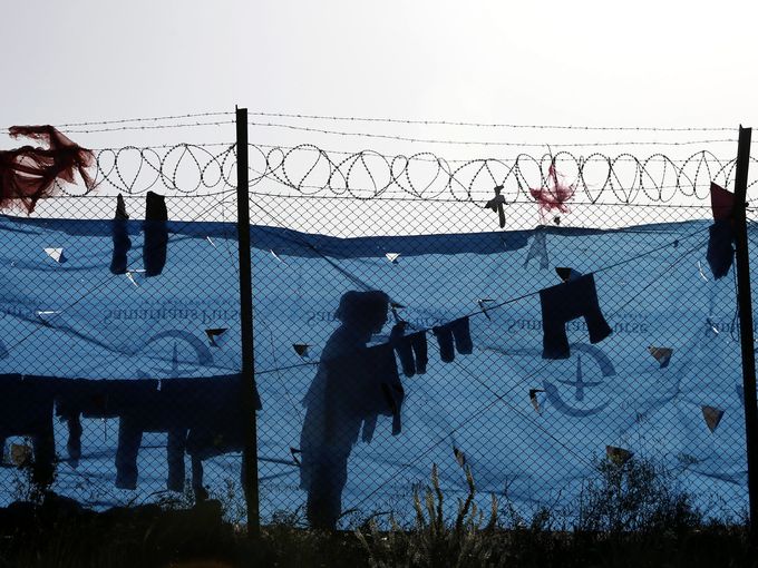 05 أبريل 2016 – اليونان، لاجئة تغسل الملابس خلف سياج مخيم مؤقت للاجئين في أحد ضواحي أثينا الغربية.