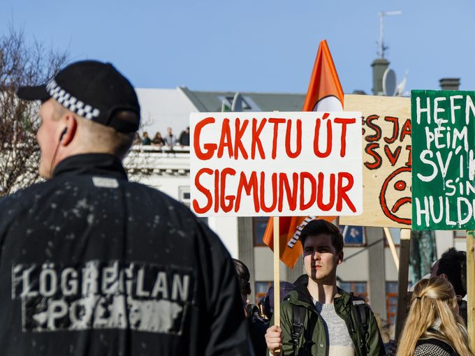 05 أبريل 2016 – آيسلندا، رجل يحمل لافتة خلال مظاهرة للمطالبة باستقالة رئيس الوزراء الآيسلندي في ريكيافيك.