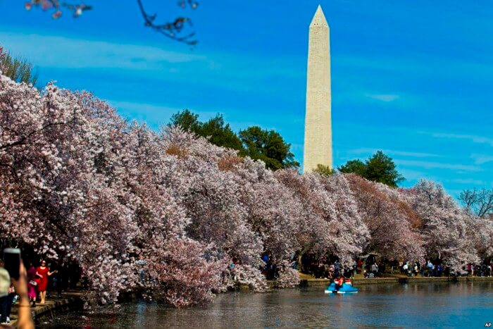 الولايات المتحدة الأمريكية، الناس يمشون على طول طريق تُزيِّنه أشجار الكرز في العاصمة واشنطن.