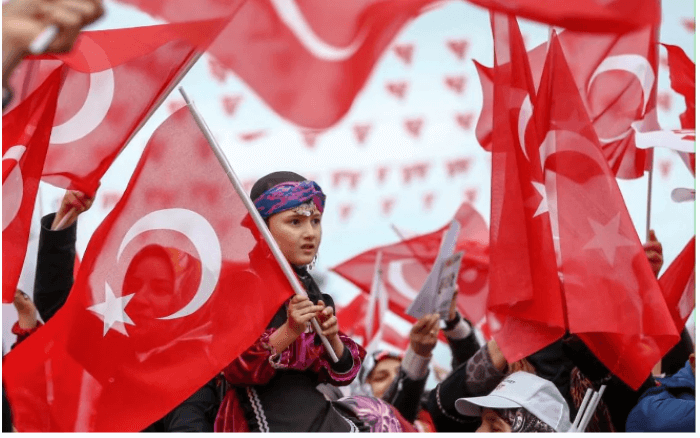 تركيا، فتاة تجلس على كتفي أمها خلال الاستماع لخطاب الرئيس التركي أردوغان في ريزي.