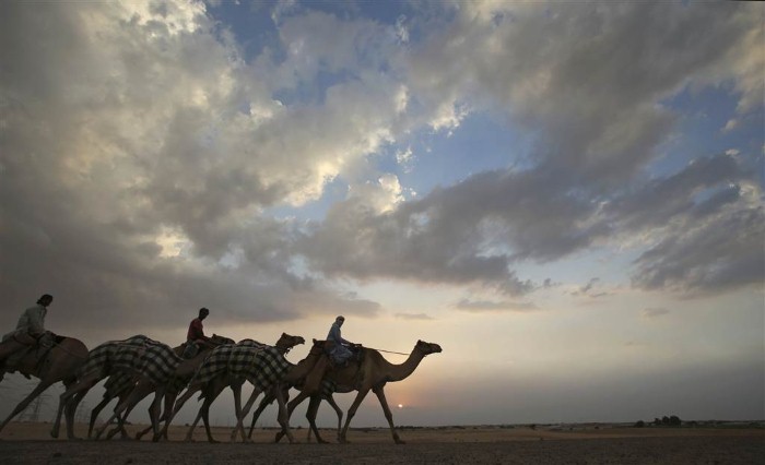 الإمارات العربية المتحدة، قطيع من الإبل يرجعون إلى مزارعهم خلال غروب الشمس جنوب شرق دبي.