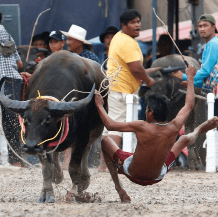 تايلاند، متسابق يخسر توازنه ويسقط عن جاموس خلال سباق الجاموس المائي السنوية في باتايا جنوب بانكوك.