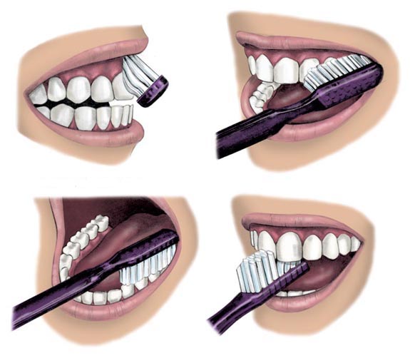 ينصح باستخدان الفرشاة بزاوية 45 درجة إلى سطح الأسنان، مع عدم استخدامها من جانب إلى جانب لأن ذلك قد يؤدي إلى شقوق في خط اللثة.