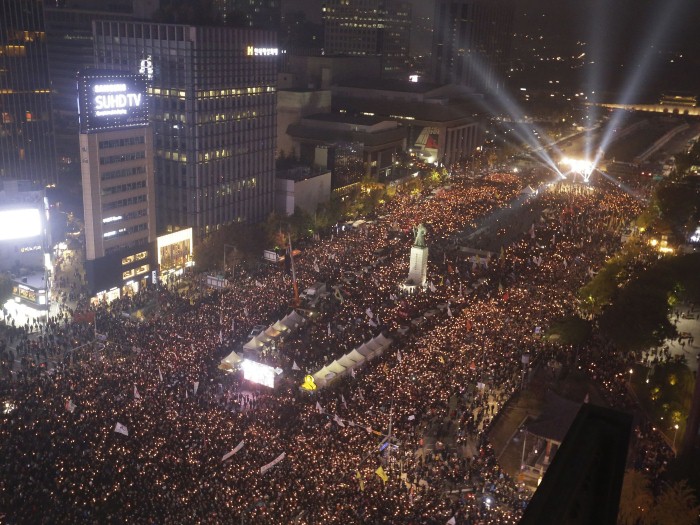 كوريا الجنوبية، محتجون كوريون جنوبيون ينظمون مسيرة تدعو الرئيس الكوري الجنوبي بارك جيون هاي للتنحي في وسط سيول.