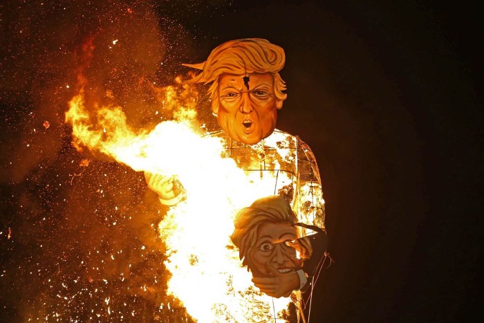 إنجلترا، حرق دمية عملاقة لدونالد ترامب خلال احتفالات الشعلة السنوية في بلدة بريطانية. حيث يختار السكان كل عام شخصية مثيرة للجدل ويصنعون لها دمية لإحراقيها بهذه المناسبة.
