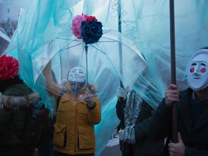 06 ديسمبر 2015 – كوريا الجنوبية، متظاهرون يرتدون أقنعة خلال مظاهرة مناهضة للحكومة في سيول.