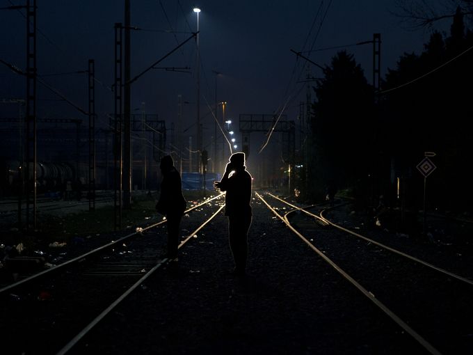 06 ديسمبر 2015 – اليونان، مهاجر يتحدث على الهاتف أثناء وقوفه بين قضبان السكك الحديدية في محطة الحدود اليونانية الشمالية.