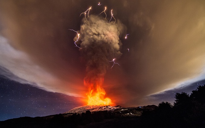 06 ديسمبر 2015 – إيطاليا، ومضات من البرق شوهدت خلال عاصفة رعدية مع ثوران بركان إتنا في جزيرة صقلية.