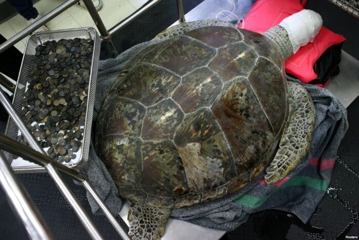 تايلاند، سلحفاة تبلغ من العمر 25 عامًا بعد خضوعها لعملية جراحية وإزالة 915 قطعة نقود معدنية من معدتها في كلية العلوم البيطرية، جامعة “تشولالونغكورن” في بانكوك.