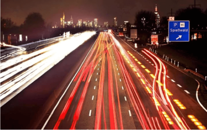 ألمانيا، مسار ضوئي ناتج عن مرور الشاحنات والسيارات على طول الطريق السريع A5 بالقرب من فرانكفورت.