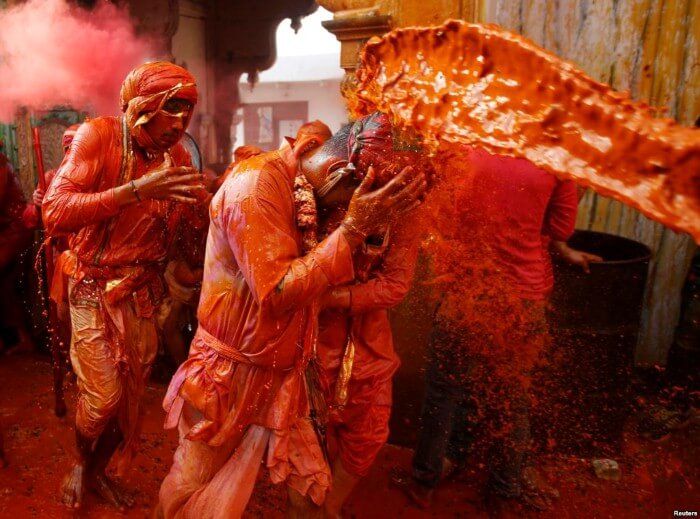 الهند، رجال يُشاركون في مهرجان هولي الديني في ولاية أوتار الهندية.