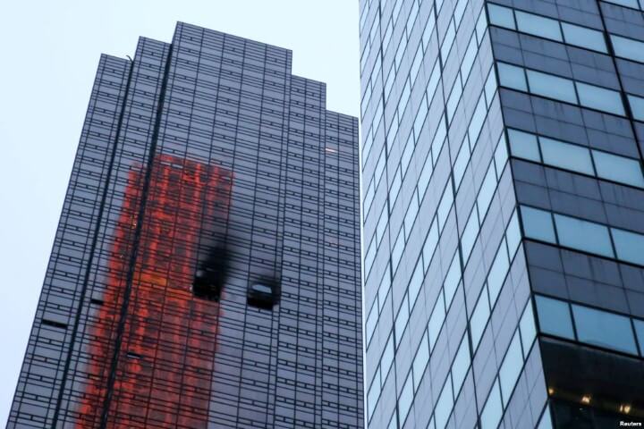 الولايات المتحدة الأمريكية، نوافذ تالفة تبدو في برج ترامب بعد اندلاع حريق في شقة بالبرج في مانهاتن، نيويورك.