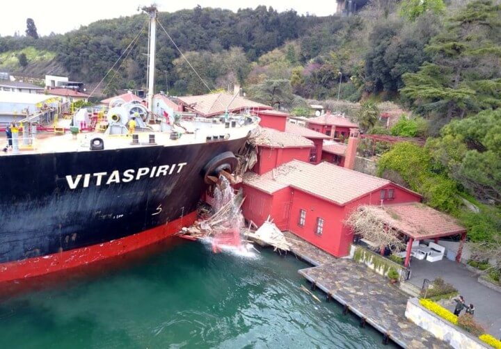 تركيا، تحطم قصر تاريخي في مضيق البوسفور بعد أن اخترقته سفينة بسبب عطل فيها أدى إلى فقد السيطرة عليها، في إسطنبول.