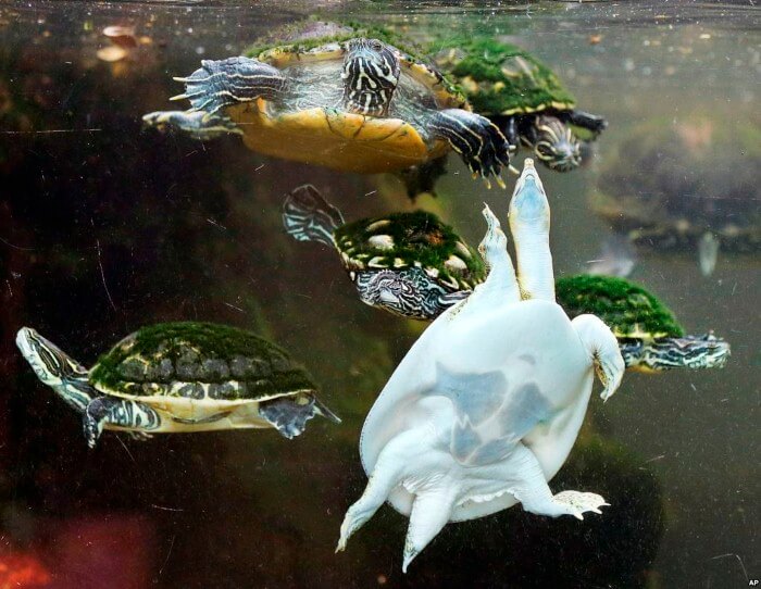 ألمانيا، أنواع مختلفة من السلاحف تسبح في بركة داخل حديقة حيوانات في فرانكفورت.