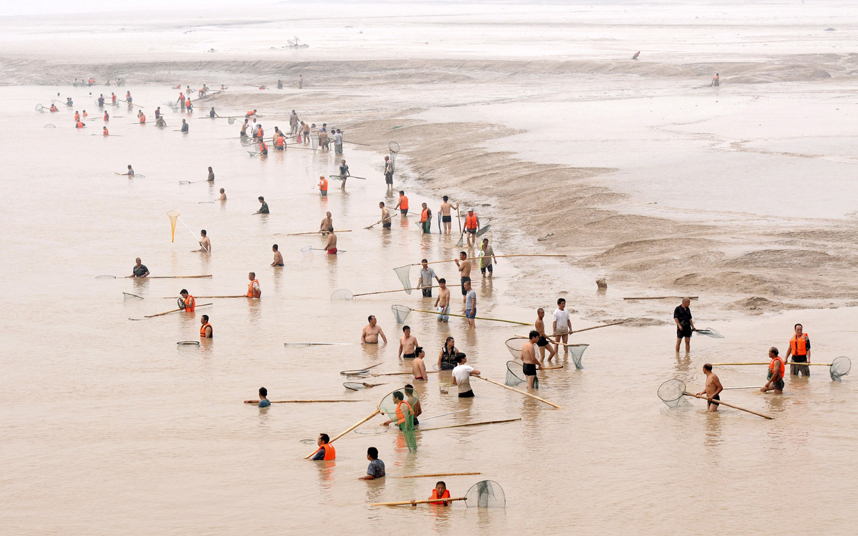 09 يوليو 2015 – الصين، مجموعة من الناس يقومون بالصيد على طول ضفة النهر الأصفر في محافظة Pinglu.