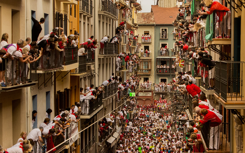 09 يوليو 2015 – أسبانيا، مشاهدة الناس لقتال الثيران مع المتسابقين في شوارع بامبلونا خلال مهرجان سان فيرمين لقتال الثيران.