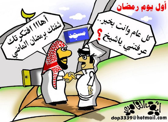 يطل علينا بعد عدة أيام قليلة شهر الخير والطاعات شهر رمضان _ بلّغنا الله وإياكم _ وكتب لنا المغفرة والرحمة والعتق من النار. ويبدأ الجميع بعمل التجهيزات اللازمة لاستقبال الشهر الكريم، وكل يجهز بأسلوبه وطريقته، فالبعض يبدأ بتجهيز البيت وتحضير مقاضي رمضان والبعض يبدأ بتجهيز نفسه لترتيل القرآن، وآخرون يترقبون ما ستعرضه الفضائيات من برامج ومسلسلات رمضانية. وقد عبَّر رسامو الكاريكاتير في أكثر من كاريكاتير عن التناقضات بين الناس في استقبال شهر الخير.