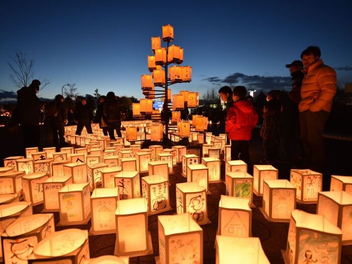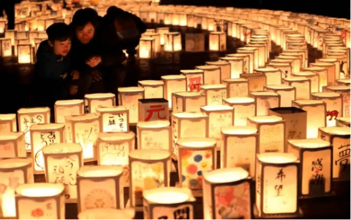 اليابان، إضاءة الفوانيس خلال حفل تأبين لإحياء ذكرى ضحايا كارثة تسونامي والزلزال الذي ضرب شواطئ اليابان في ناتوري، مياجي.