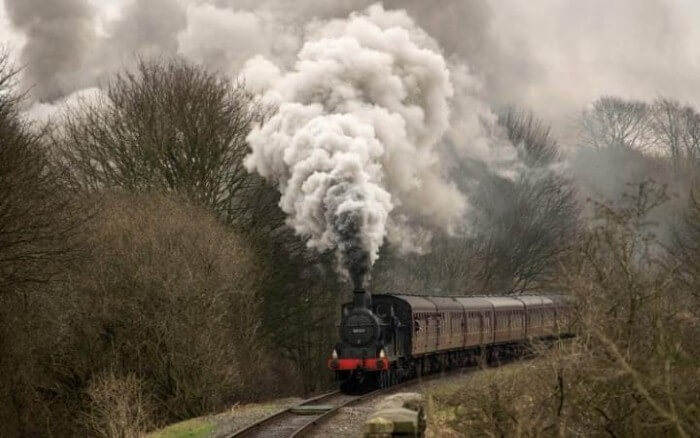 إنجلترا، قطار بخاري يسير على طول سكة حديدية في لانكشاير.