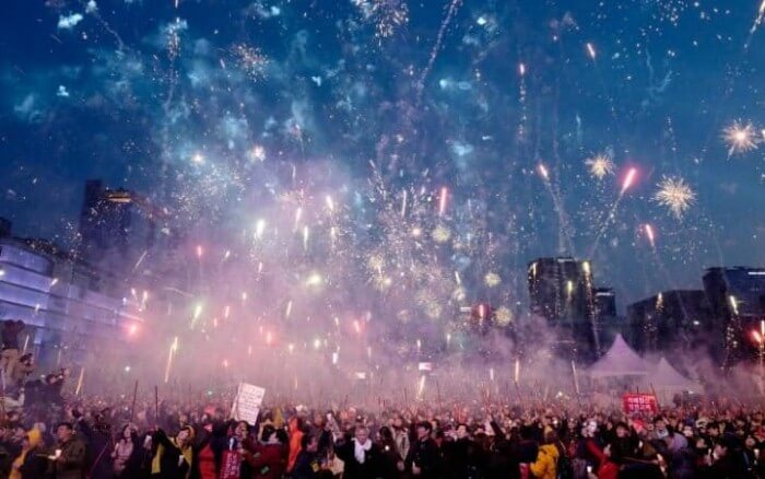 كوريا الجنوبية، إطلاق الألعاب النارية في سماء سيول من قبل محتفلين بعد قرار المحكمة بإقالة رئيسة البلاد بارك جيون هاي بتهم فساد موجهة لها.