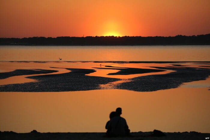 فرنسا، الناس يُتابعون غروب الشمس من شاطئ خليج أركاشون.
