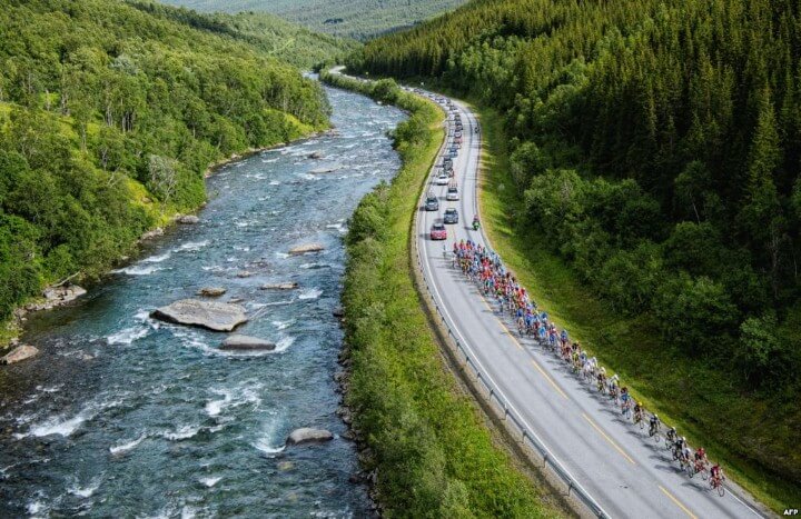 النرويج، متسابقين على دراجات هوائية يقطعون طريق بين الطبيعة خلال المرحلة الثانية من سباق القطب الشمالي بين سيويفجان ومطار باردوفوس.