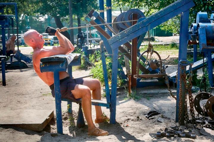 أوكرانيا، رجل يرفع الأثقال في نادي رياضي خارجي داخل منتزه تحت أشعة الشمس بالعاصمة كييف.