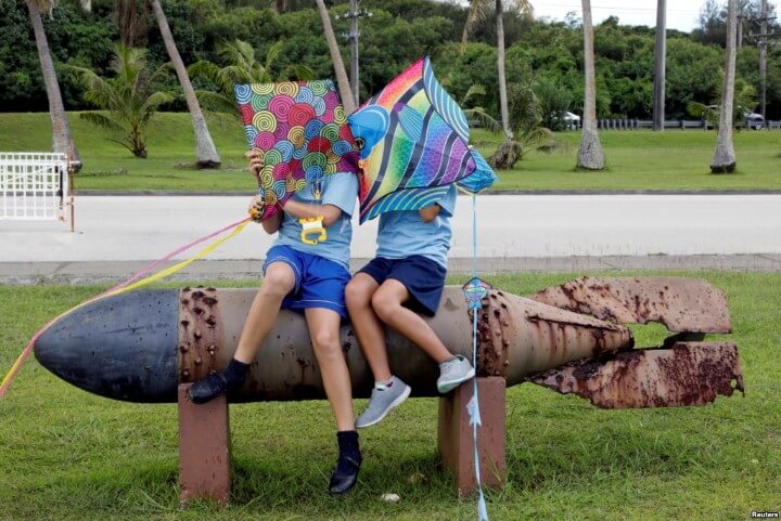 جزيرة غوام، تلميذان يجلسان على طوربيد مائي من بقايا الحرب العالمية الثانية في حديقة أسان التذكارية بالجزيرة، وهي إقليم أمريكي في المحيط الهادئ.