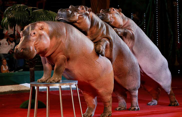 أفراس النهر تقدم عرضًا في سيرك في سيبيريا.