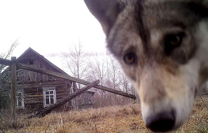 ذئب ينظر إلى كاميرا في منطقة محظورة على بعد 30 كلم عن مفاعل تشيرنوبل النووي في روسيا البيضاء.