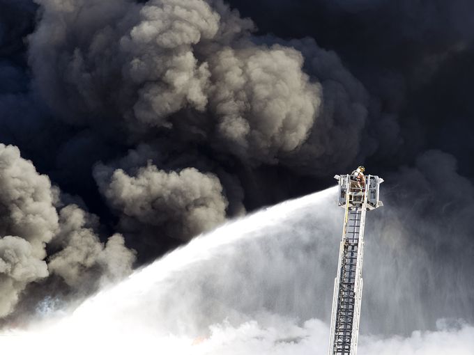 13 أبريل 2016 – الولايات المتحدة الأمريكية، رجل إطفاء يعمل على إخماد حريق ضخم شب في مصنع جين لقطع غيارات السيارات في مدينة ترافيرس.