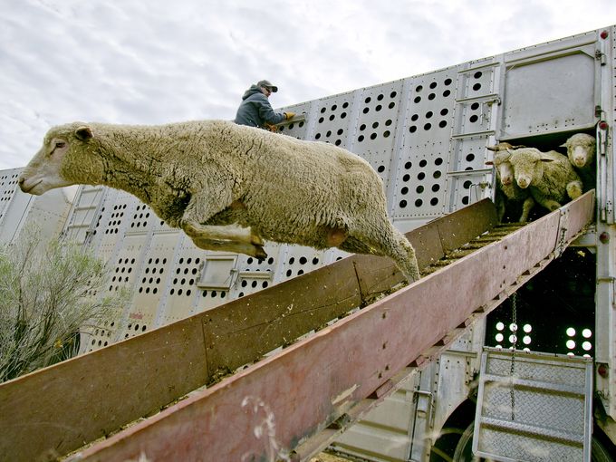 13 أبريل 2016 – الولايات المتحدة الأمريكية، أغنام محلية تقفز من شاحنة خلال الإفراج عنها في سفوح بويز لترعى في التلال الطبيعية.