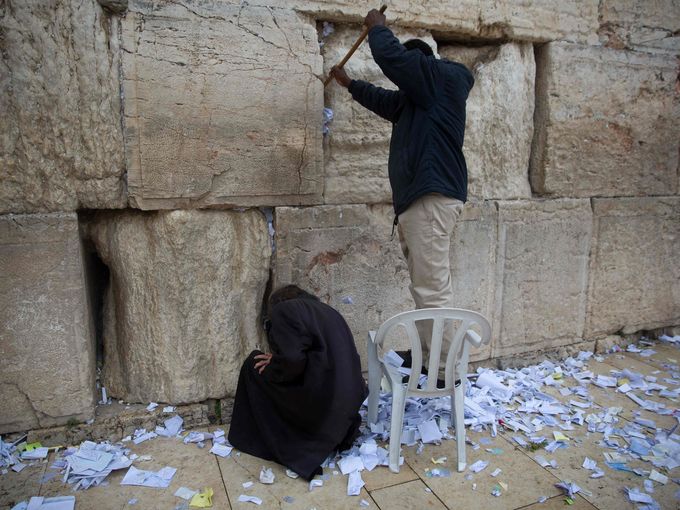 13 أبريل 2016 – الأراضي الفلسطينية المحتلة، موظفون يهود يقومون بإزالة آلاف الأوراق التي وضعها اليهود في حائظ البراق ظنًا منهم أنها موجهة إلى الله ليغفر خطاياهم وذلك استعدادًا للأعياد اليهودية المزعومة، في مدينة القدس القديمة.