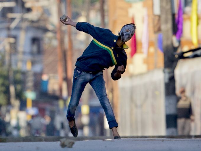 13 أبريل 2016 – الهند، متظاهر كشميري يرشق رجال الشرطة الهندية بالحجارة خلال احتجاج في سريناجار.