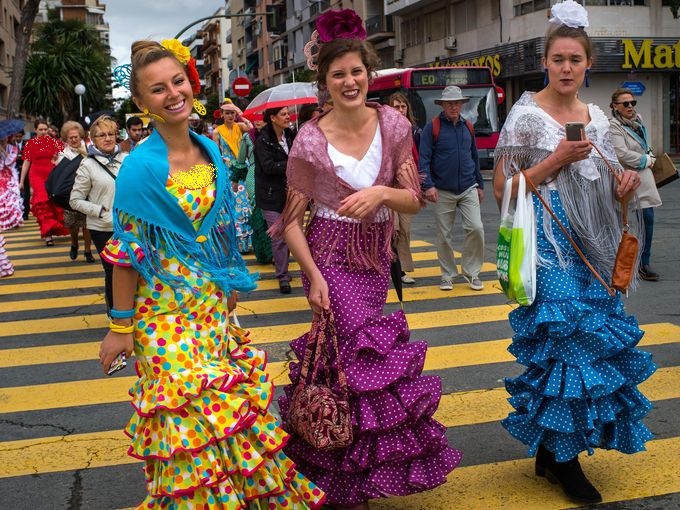 13 أبريل 2016 – إسبانيا، نساء ترتدين فساتين سفيلانا التقليدية خلال توجههن إلى معرض أبريل في إشبيلية.