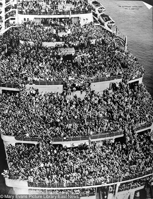 بعد الانتهاء من الخدمة العسكرية في أوروبا الغربية، قامت المدرعة البحرية البريطانية “الملكة اليزابيث” إيصال الجنود الأمريكيين إلى نيويورك بأمان.