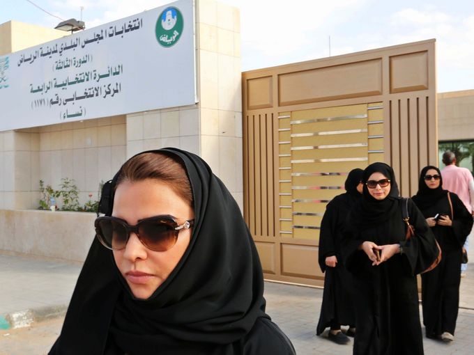 13 ديسمبر 2015 – المملكة العربية السعودية، نساء سعوديات يغادرن مركز اقتراع بعد إدلائهن بأصواتهن في الانتخابات البلدية بالرياض، يُذكر أنها المرأة الأولى التي يُسمح بها للمرأة السعودية بالتصويت في الانتخابات البلدية بالبلاد.