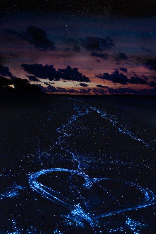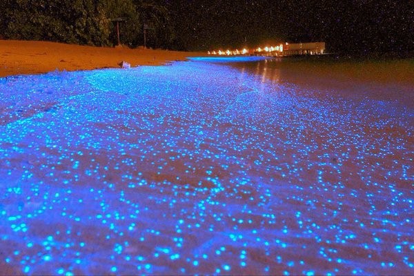 صور العالم – الضوء الأزرق على شاطئ جزيرة فادهو في جزر المالديف كأنه اللؤلؤ المنثور ليلًا، في مشهد طبيعي يُدهش القلوب ويسحر العيون.