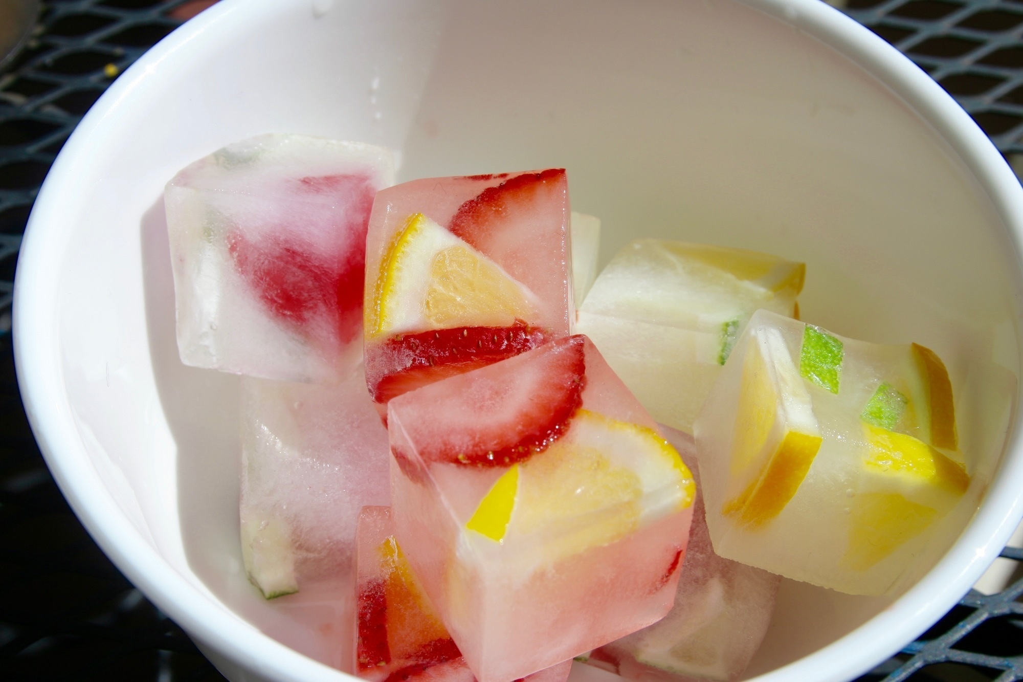ملئ علبة مكعبات الثلج ببعض الفاكهة وقم وصب الماء عليها، وتجميدها لبضع ساعات في الثلاجة.